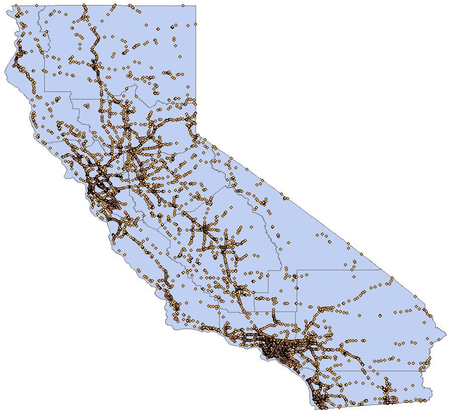 Description: Annual average daily traffic is the total volume for the year divided by 365 days. The traffic count year is from October 1st through September 30th. Very few locations in California are actually counted continuously. Traffic Counting is generally performed by electronic counting instruments moved from location throughout the State in a program of continuous traffic count sampling. The resulting counts are adjusted to an estimate of annual average daily traffic by compensating for seasonal influence, weekly variation and other variables which may be present. Annual ADT is necessary for presenting a statewide picture of traffic flow, evaluating traffic trends, computing accident rates. planning and designing highways and other purposes.Traffic Census Program Page
